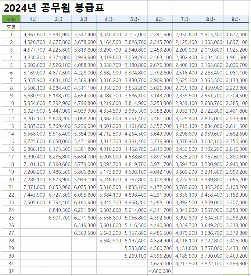 다음은 2024년과 2025년의 공무원 봉급표를 비교한 예시입니다: